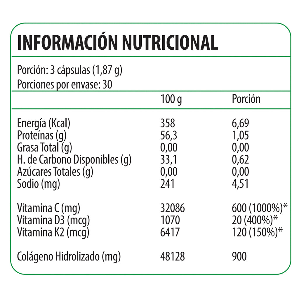 Colágeno: 900mg; Vitamina C: 600mg; Vitamina D3: 800UI y Vitamina K2: 120mcg