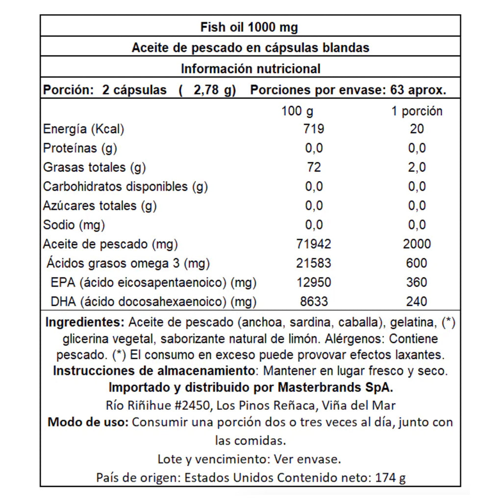 Omega 3 Fish Oil contiene 600 mg de ácidos grasos omega 3 en cada porción de 2 cápsulas blandas con esencia de limón.